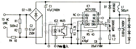 交流电断开时,电路中储存的电量通过高精密电阻R1和贴片电阻R2释放,从而消除电击的危险。虽然也可以使用一只1MΩ通孔式安装的电阻器作为泄放电阻,但两只表贴500kΩ电阻器串联的成本更低,并且可以方便PCB板的布线。只要在线电压上,用上只额定值的电容C2,就可以用任何一只适当击穿电压和导通电阻小的功率MOSFET,如MTD1N60E或IRF820。电感L1为500mH,应能工作于100kHz下,且连续工作电流应大于350mA。您可以使用Coilcraft公司的RFBl010或DR0810系列表面贴装电感器,或用合适的磁芯材料来绕制电感器。加光耦IC2可以实现用微电脑控制LED照明的亮度调节,其方法是利用1C1的反馈端②脚进行脉宽调制。